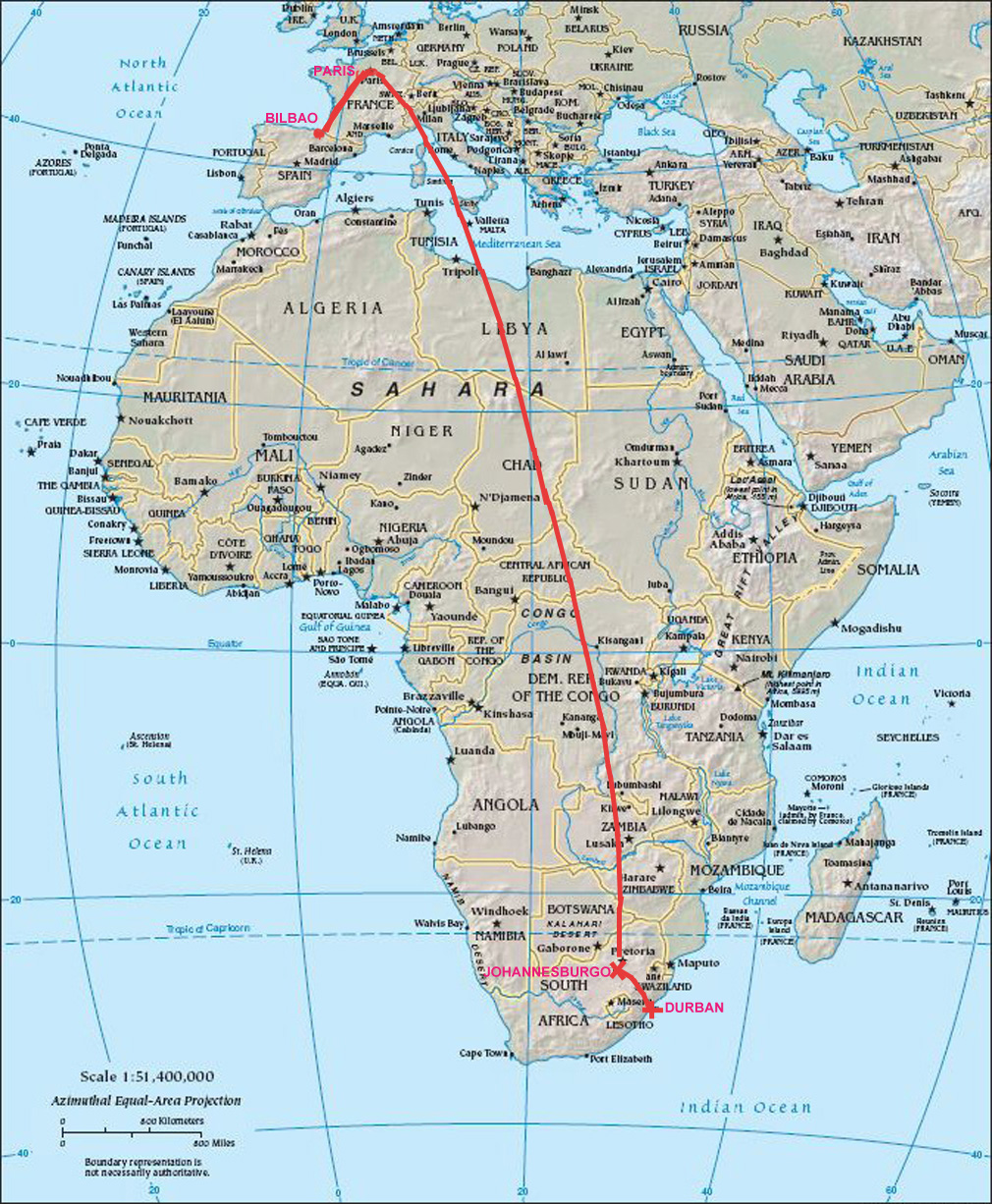 Ruta de viaje: Bilbao-Paris-Johannesburg-Durban.